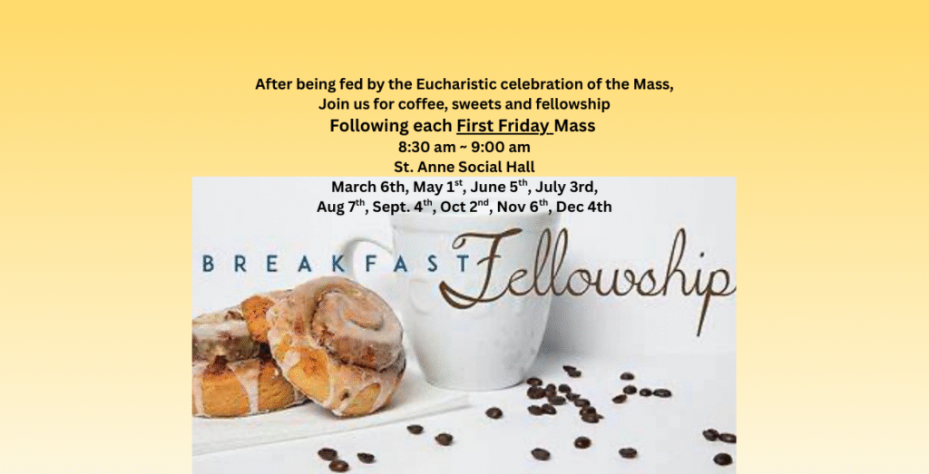 FIRST FRIDAY ADORATION – Please note that the schedule for each First Friday of the month: Exposition of the Blessed Sacrament 7 am to 7:45 am, Mass 8 am- 8:30 am, Coffee and sweets in the social hall from 8:30 to 9:00 am, Adoration 9:00 am to 6:00 pm. (First Friday Dates: March 6th, May 1st, June 5th, July 3rd, Aug 7th, Sept 4th, Oct 2nd, Nov 6th and Dec 4th)